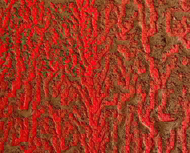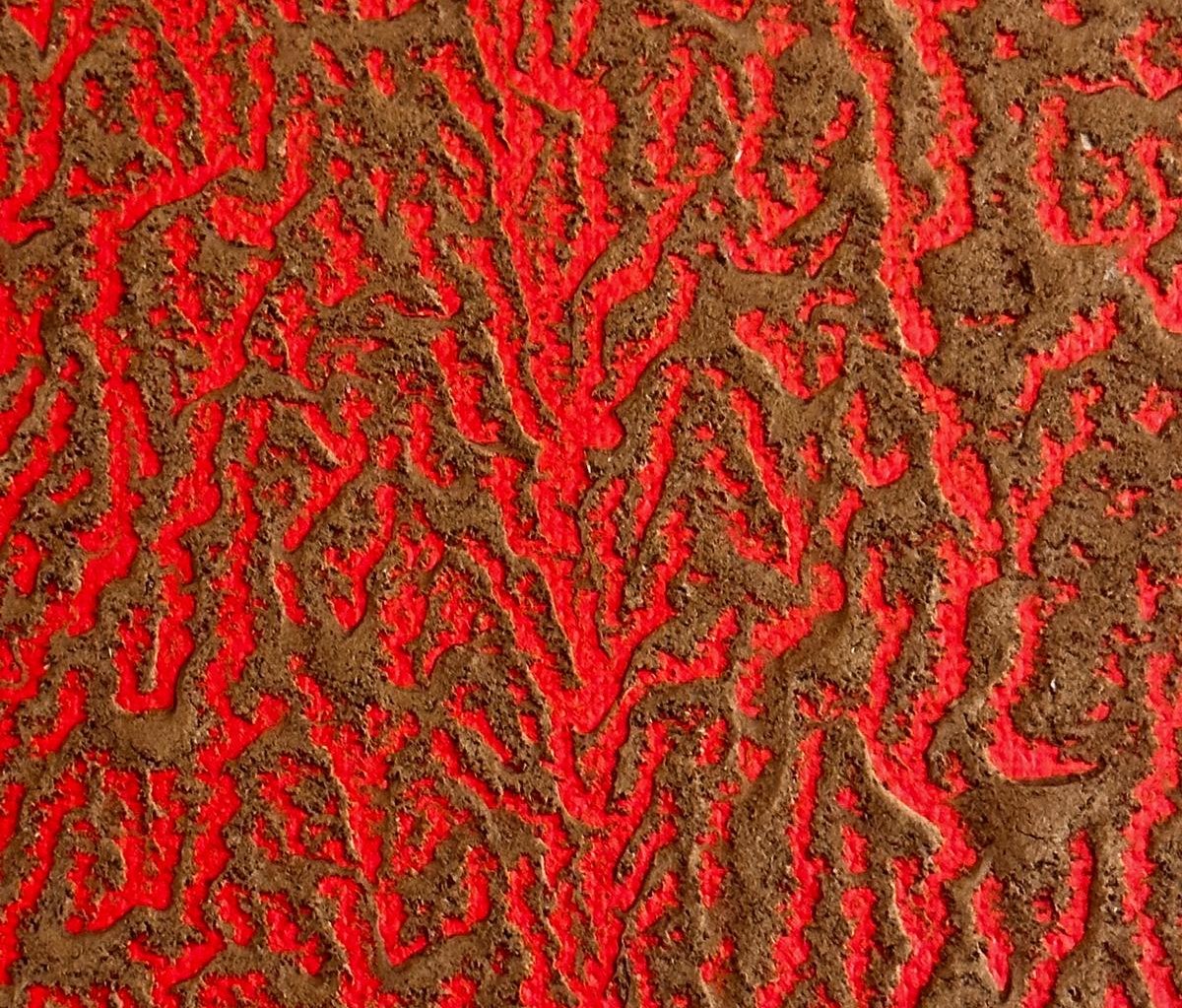Mokka-Absatz auf rot grundierter Leinwand, Detailaufnahme – physikalisch emergente Musterbildung