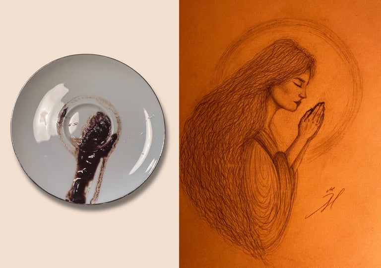Betende Frau, 2024 – Werktyp A: Mokka-Absatz auf Keramik-Unterteller (links) und malerische Skizze nach dem Leseprozess (rechts)