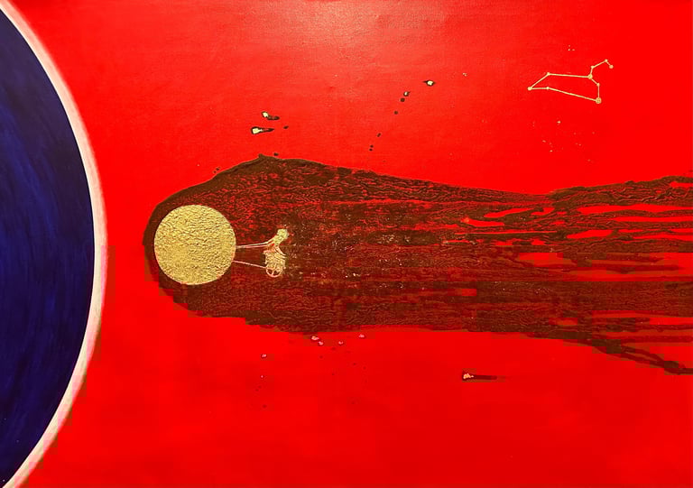 Work description: Read, painted, moon flowed autonomously, leaves guided with brush. Combination of autonomous flow process and dialogical guidance within the same work.